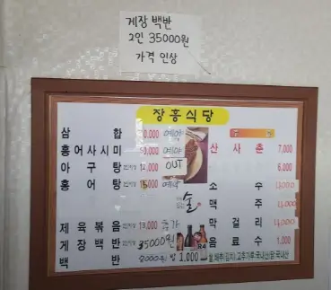 익산 장흥식당 메뉴 표